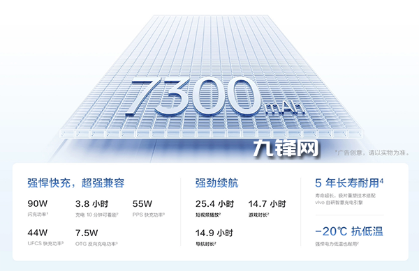 續(xù)航:7300mAh超薄藍海電池(單電芯,能量密度838Wh/L),90W有線快充,7.5W有線反向充電,兼容55W PPS+44W UFCS快充;
