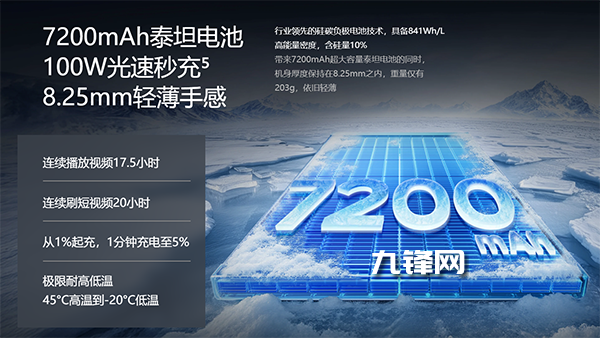 該機(jī)在續(xù)航方面表現(xiàn)十分出色,不僅配備了7200mAh泰坦大電池,10%硅含量的硅碳負(fù)極,能量密度841Wh/L,另外它還支持了100W光速秒充,在續(xù)航這條賽道上,又卷出了新高度。