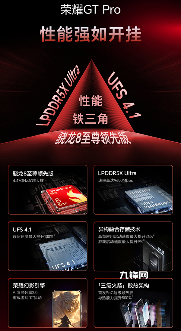 作為榮耀的全新性能旗艦,榮耀GT Pro在采用驍龍8至尊領(lǐng)先版的同時(shí),也配備了LPDDR5X Ultra內(nèi)存和UFS 4.1閃存,組成最強(qiáng)性能鐵三角,在硬件性能上對標(biāo)甚至超越同樣主打性能的iQOO 13和一加13。