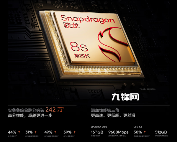 其中,驍龍8s Gen4處理器經(jīng)藍(lán)晶技術(shù)棧深度調(diào)校,基于臺積電4nm制程工藝打造,擁有1個(gè)3.21GHz超大核心、5個(gè)A720大核心和2個(gè)2.01GHz A720大核,驍龍8至尊版同款GPU架構(gòu)(Adreno A825),相較上代產(chǎn)品GPU性能提升49%,能效提升了39%。