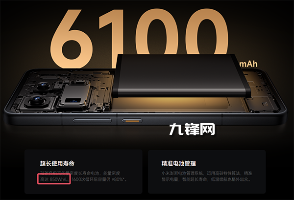 850Wh/L,小米15S Pro配置的是小米金沙江電池,并且有著850Wh/L電池能量密度。