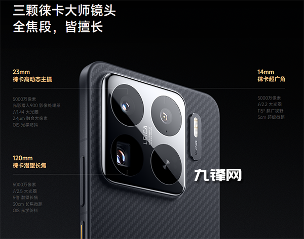 徠卡超廣角攝像頭:5000萬(wàn)像素,三星S5KJN1傳感器,1/2.76英寸,115°FOV,5cm微距,等效焦距14mm,F(xiàn)2.2光圈,AF自動(dòng)對(duì)焦