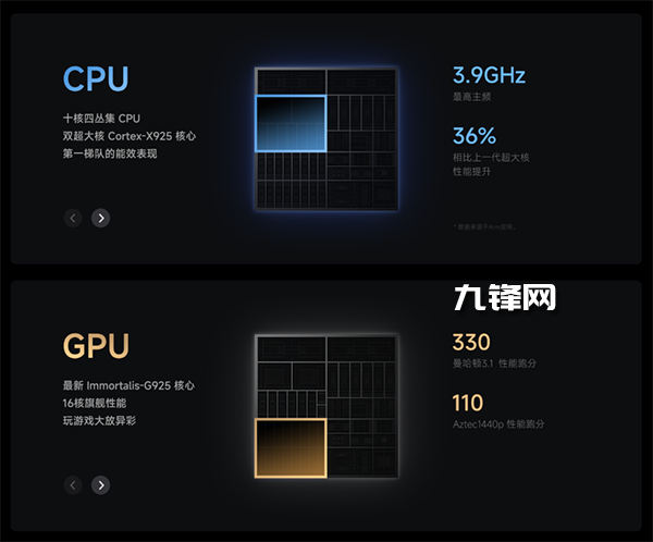 這次的小米15S Pro的核心賣點自然是自研的玄戒O1芯片,這款芯片基于臺積電N3E工藝打造,CPU部分為2個3.9GHz的X925超大核+4個3.4GHz的A725核心+2個1.9GHz的A725核心+ 2個1.8GHz的A520小核心組合,GPU為Immortalis-G925 MC16,GPU核心頻率1.39GHz。