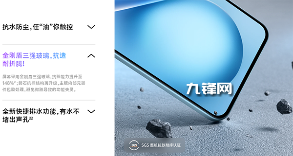 還有就是,這個(gè)屏幕蓋板升級(jí)為金剛盾三強(qiáng)玻璃,搭配再次升級(jí)的磐石抗摔架構(gòu),整機(jī)通過了SGS整機(jī)抗跌耐摔認(rèn)證。