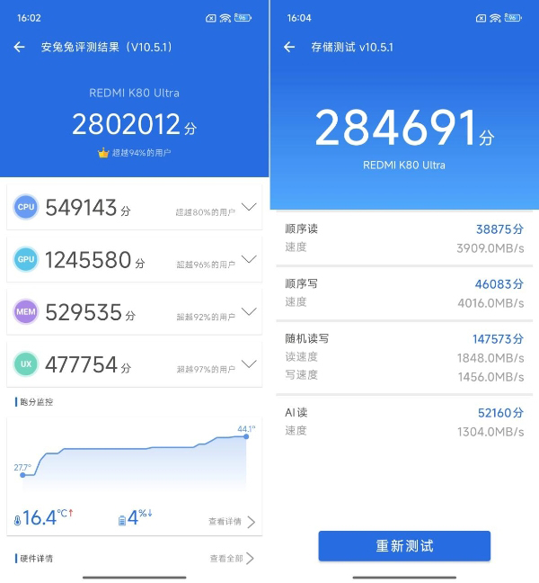在存儲(chǔ)測(cè)試中,REDMI K80至尊版的得分為284691分,其中順序讀取速度為3909MB/s,得分38875分;順序?qū)懭胨俣葹?016MB/s,得分46083分;隨機(jī)讀取速度為1848MB/s,隨機(jī)寫入速度為1456MB/s,得分147573分;AI速度1304MB/s,得分51260分。