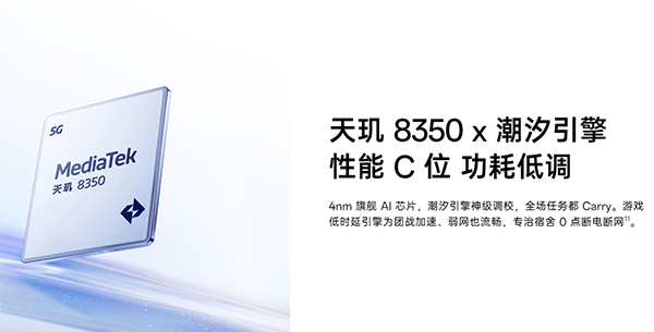 性能上搭載的是聯(lián)發(fā)科天璣8350芯片,采用臺積電4nm工藝制程,性能相比前代提升約15%,并且搭配的是LPDDR5X規(guī)格的內(nèi)存和UFS 3.1規(guī)格的閃存,進一步提升數(shù)據(jù)讀寫速度,CPU為2.6GHz主頻的八核架構(gòu),性能定位中端,可流暢運行日常應(yīng)用。