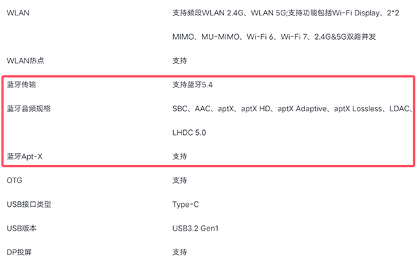 藍(lán)牙5.4,音頻規(guī)格上支持SBC、AAC、aptX、aptX HD、aptX Adaptive、aptX Lossless、LDAC、LHDC 5.0。