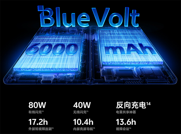 也就是說,vivo X Fold5配備了一塊6000mAh藍海電池,支持80W快速充電和40W無線充電,另外它還至高支持5W無線反向充電,另外還支持OTG反向充電(也就是有線反向充電)。