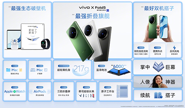 vivo X Fold5以輕量化機(jī)身與IPX9+防水打破折疊屏硬件局限,跨生態(tài)互聯(lián)功能真正打通蘋果與安卓設(shè)備壁壘,影像系統(tǒng)與6000mAh續(xù)航則保證了旗艦級體驗的完整性,在折疊屏“堆料”與“減重”的博弈中,它用“全能無短板”的表現(xiàn),成為雙設(shè)備用戶的實用之選。