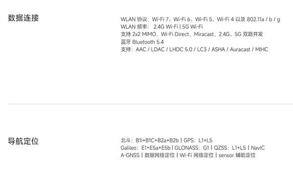 藍牙方面,該機配置的是藍牙5.4,并且支持:AAC/LDAC/LHDC5.0/LC3/ASHA/Auracast/MIHC。