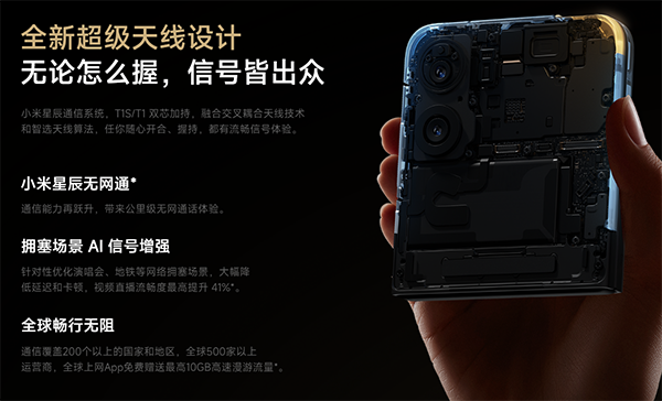 搭載小米星辰通信,軟硬協(xié)同,AI賦能,帶來全方位領先的通信體驗,采用高性能旗艦天線組,為了保證閉合場景下的通信表現(xiàn),特別設計了一枚超級天線:位于機身頂邊框,覆蓋用戶最常用的城區(qū)中高頻頻段,最大程度避免了小折疊產(chǎn)品常見的握死問題。