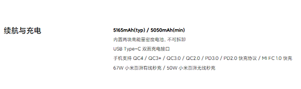 在兼容性方面,該機支持充電協(xié)議包括QC4/QC3+/QC3.0/QC2.0/PD3.0/PD2.0/MI FC 1.0快充協(xié)議。
