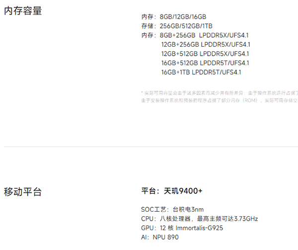 LPDDR5X規(guī)格內(nèi)存(16GB+512GB版,16GB+1TB版為L(zhǎng)PDDR5T內(nèi)存),UFS 4.1規(guī)格的閃存。