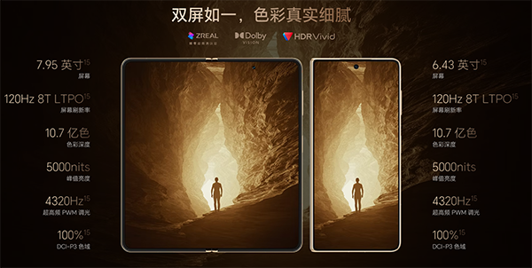 它的內(nèi)外兩塊屏幕在顯示參數(shù)與專業(yè)度上有著很高的一致性,雙旗艦級屏幕采用6.43英寸外屏+7.95英寸內(nèi)屏組合,全鏈路支持1-120Hz 8T LTPO動(dòng)態(tài)刷新率,10.7億色深,呈現(xiàn)專業(yè)級顯示效果,杜比視界認(rèn)證更拓展影音場景表現(xiàn)力。