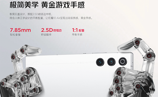 從整體的外觀上來看,這一代的紅魔10 AIR采用了6.8英寸悟空全面屏,屏幕無前置鏡頭開孔,在游戲、視頻以及閱讀時都不會有遮擋,屏幕的左右邊框僅1.48mm,屏占比達到了93.7%,帶來滿屏的視覺效果。