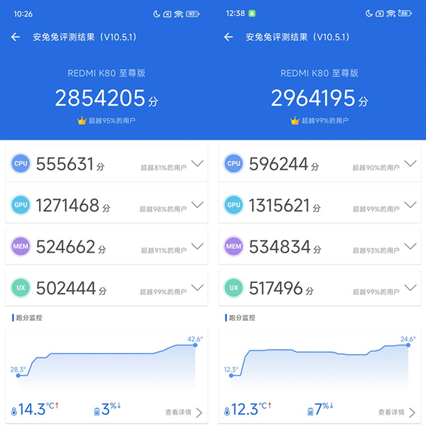安兔兔測試中,紅米K80至尊版取得了超過285萬到296萬分的成績(測試版本為16GB+1TB版),符合天璣9400+處理器的應有水平。