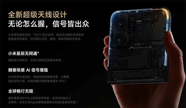 在通信方面,這一代的小米MIX Flip2搭載小米星辰通信,軟硬協(xié)同,AI賦能,帶來全方位領(lǐng)先的通信體驗(yàn),它還采用高性能旗艦天線組,為了保證閉合場景下的通信表現(xiàn),特別設(shè)計(jì)了一枚「超級天線」:位于機(jī)身頂邊框,覆蓋用戶最常用的城區(qū)中高頻頻段,最大程度避免了小折疊產(chǎn)品常見的握死問題。