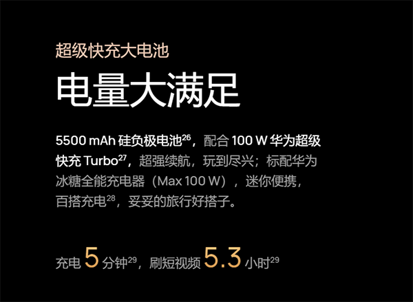 充電方面,支持100W華為超級快充Turbo,而且標配了更加迷你便攜的華為冰糖全能充電器(Max 100W)。