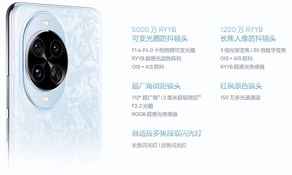 在影像方面,華為nova14 Pro后置5000萬像素RYYB可變光圈防抖鏡頭(F1.4~F4.0光圈,OIS光學(xué)防抖)+ 1200萬像素RYYB長焦人像防抖鏡頭(F2.4光圈,OIS光學(xué)防抖)+800萬像素超廣角微距鏡頭(F2.2光圈)+ 150萬多光譜通道紅楓原色鏡頭(F2.4光圈),前置5000萬像素超清人像追焦鏡頭(F2.0光圈)+ 800萬像素5倍變焦人像特寫鏡頭(F2.2光圈)。