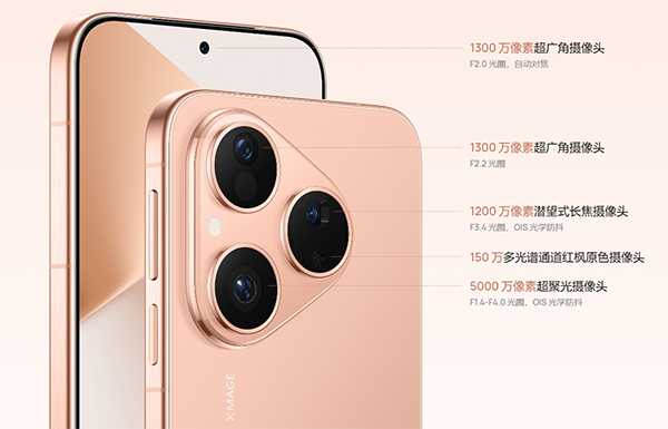 華為Pura80標準版搭載紅楓原色影像系統(tǒng),后置5000萬RYYB超聚光主攝+1300萬廣角鏡頭+1200萬潛望長焦鏡頭+150萬多光譜鏡頭,主攝支持F1.4-4.0十檔可變光圈,主攝和長焦鏡頭支持OIS光學防抖。