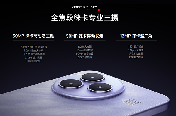 在影像方面,小米civi5 Pro延續(xù)了前座的三攝系統(tǒng),主攝采用25mm的光影獵人800傳感器,傳承了旗艦同款的徠卡Summilux光學系統(tǒng),并且擁有f/1.63大光圈,支持OIS光學防抖,保證了手機影像的旗艦水準。