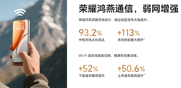 在信號表現(xiàn)上也更強(qiáng)勁,給到了榮耀鴻燕通信功能,在弱網(wǎng)的環(huán)境中也能夠更加高效的連接5G網(wǎng)絡(luò)。