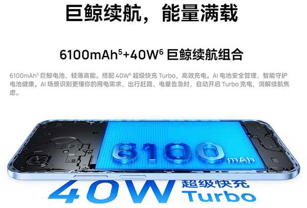 在電池方面,Hi暢享80 Pro搭載了一塊6100mAh超大容量巨鯨電池。這樣大的電池,帶來(lái)了持久的續(xù)航,在中度使用時(shí),能實(shí)現(xiàn)兩天一充。