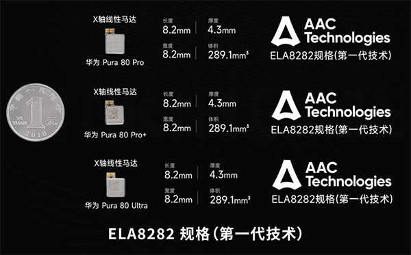 ELA8282規(guī)格,華為Pura80 Ultra配置的是瑞聲科技的ELA8282規(guī)格X軸線性馬達(dá)。