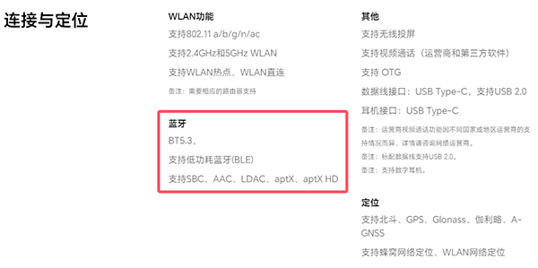 藍牙方面,該機配置的是藍牙5.3,并且支持低功耗藍牙(BLE),另外還支持SBC、AAC、LDAC、aptX、aptX HD協(xié)議。
