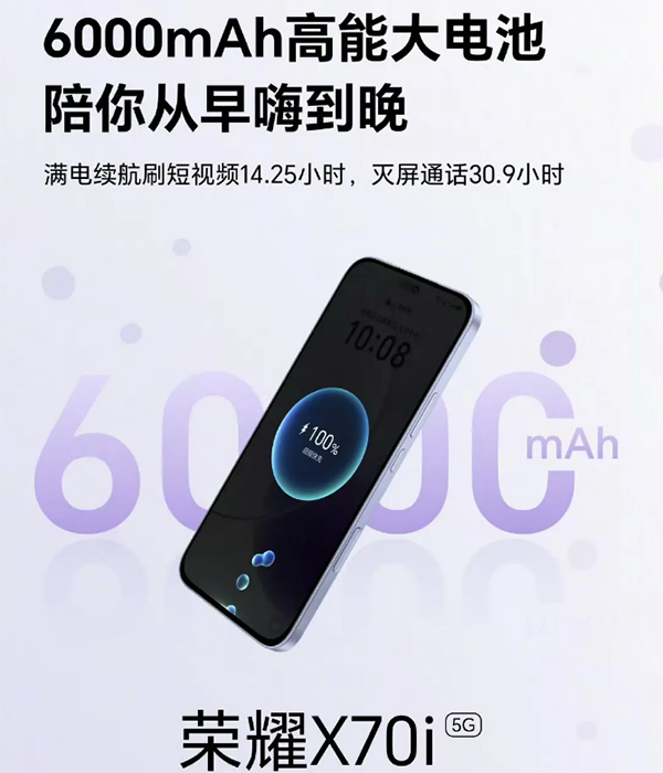 續(xù)航方面,榮耀X70i內(nèi)置了一塊6000mAh的大容量電池,確保了長(zhǎng)時(shí)間的續(xù)航能力。