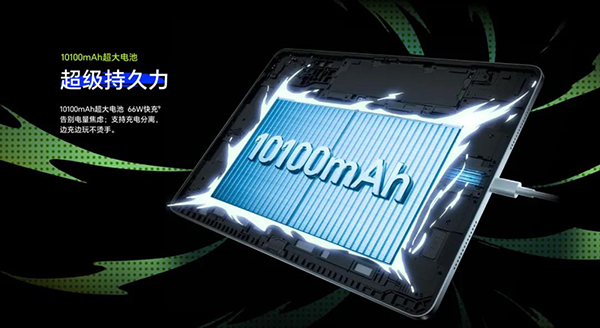 該產(chǎn)品在5.95mm厚度和532g的纖薄機(jī)身內(nèi),塞進(jìn)了10100mAh超大電池,支持66瓦快充技術(shù),充電10分鐘游戲2小時,90分鐘內(nèi)即可充滿全部電量。