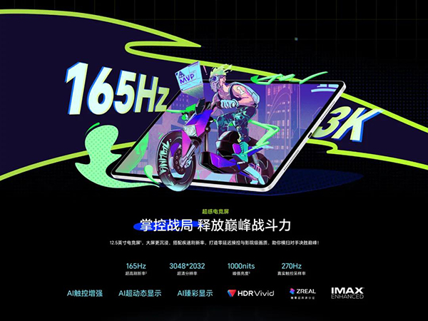 在屏幕上,搭載165Hz3K護眼電競屏,打造檔位最強顯示體驗,165Hz達到了旗艦平板最高刷新率,搭配《穿越火線-槍戰(zhàn)王者》《爐石傳說》等眾多業(yè)界熱門游戲的定向適配優(yōu)化,為玩家?guī)鞵C級別高幀體驗。