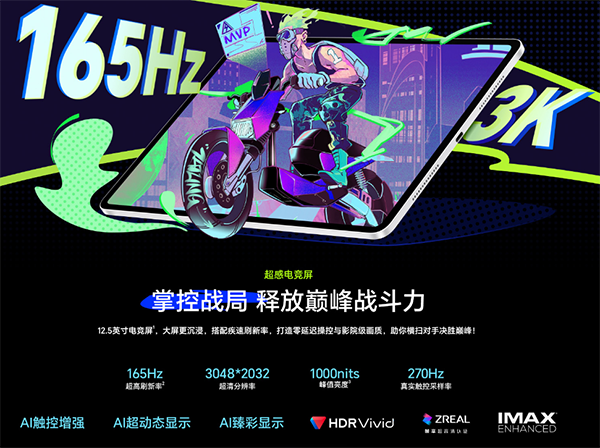 屏幕:12.5英寸,分辨率是3048×2032(屬于是3K級別),LCD屏幕,165Hz高刷新率(支持7檔,165Hz/144Hz/120Hz/90Hz/60Hz/48Hz/30Hz),峰值亮度1000nit,270Hz觸控采樣率,10.7億色,DCI-P3廣色域,全局DC調(diào)光;