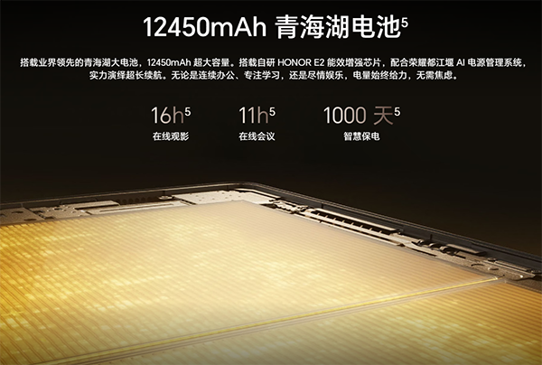 大屏幕、輕薄機(jī)身,對產(chǎn)品的續(xù)航帶來了更高的挑戰(zhàn)。榮耀平板MagicPad3搭載業(yè)界最大12450mAh青海湖電池,結(jié)合榮耀自研能效增強(qiáng)芯片HONOR E2與都江堰AI電源管理系統(tǒng),功耗表現(xiàn)進(jìn)一步降低,根據(jù)官方的說法,支持18小時(shí)離線視頻、11小時(shí)在線會(huì)議,徹底終結(jié)續(xù)航焦慮。