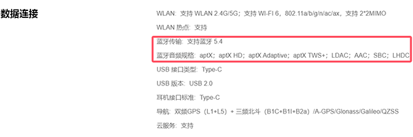 藍牙5.4,藍牙音頻規(guī)格支持aptX、aptX HD、aptX Adaptive、aptX TWS+、LDAC、AAC、SBC、LHDC。
