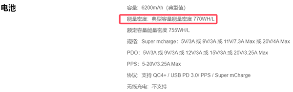 也就是說,魅族Note16 Pro內(nèi)置了一塊6200mAh的超大容量電池,能量密度是770Wh/L。