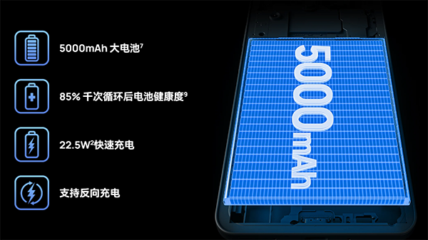 同時,該機支持22.5W超級快充,能夠快速回血,還具備反向充電功能,可為其他設(shè)備應(yīng)急供電,滿足用戶多設(shè)備場景下的緊急用電需求,緩解電量焦慮。