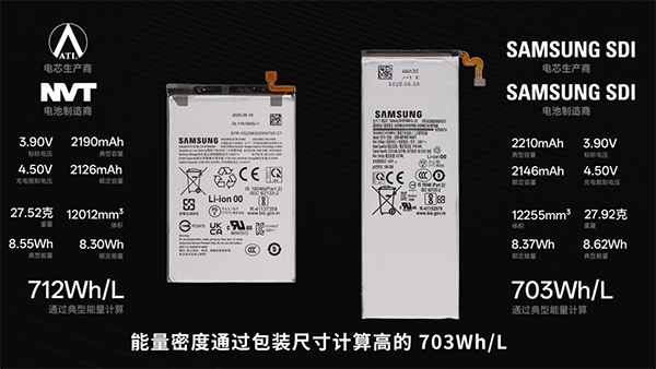 另外,三星Galaxy Z Fold7配置的是一高一矮的電池,高的是703Wh/L,矮的是712Wh/L。