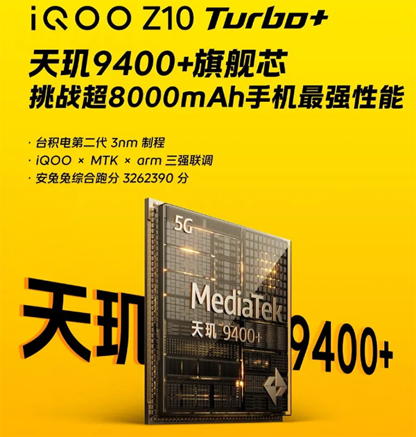 3納米,iQOO Z10 Turbo+搭載的是天璣9400+,該芯片處理器采用的是臺積電3納米工藝制程。