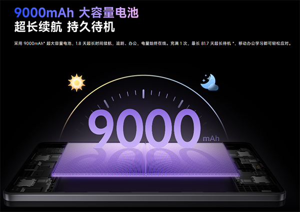 9000mAh,紅米平板Pad2內(nèi)置9000mAh電池,支持18W的有線充電。