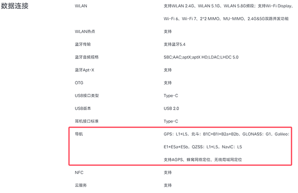 雙頻GPS(L1+L5)和四頻北斗(B1C+B1I+B2a+B2b),在導航方面,該機配置的是雙頻GPS:L1+L5,四頻北斗:B1C+B1I+B2a+B2b,GLONASS:G1,Galileo:E1+E5a+E5b,QZSS:L1+L5,NavIC:L5,支持AGPS、蜂窩網絡定位、無線局域網定位。