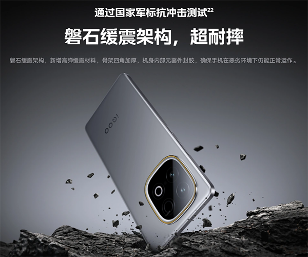 抗摔,iQOO Z10 Turbo+整機采用磐石緩震架構,并通過了國家軍標抗沖擊測試,機身骨架四角加厚,防止跌落瞬間屏幕四角震碎;高彈緩震材料對屏幕四周形成全包圍防護。