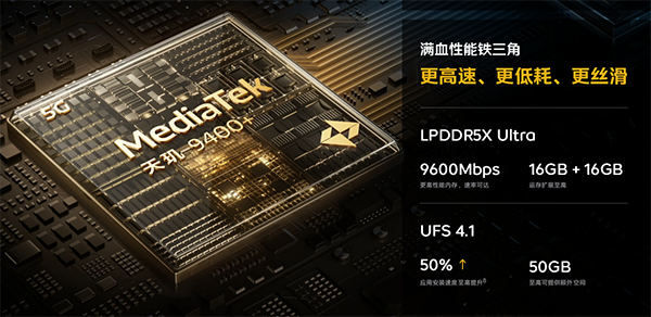 性能上采用了天璣9400+以及LPDDR5X LPDDR5X內存、UFS4.1閃存組成的新一代性能鐵三角,也就是當下手機性能最強配置之一,同時還有提供超分、超幀體驗的自研電競芯片Q2,屬于當下安卓性能的第一梯隊。