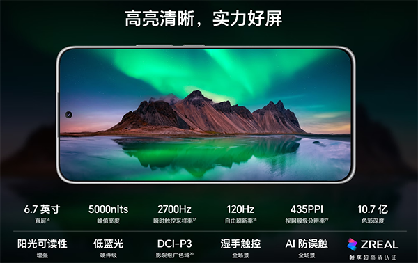 整機(jī)采用直邊直屏方案,正面是6.7英寸、1.5K榮耀綠洲護(hù)眼屏,具備3840Hz高頻PWM零風(fēng)險調(diào)光、AI離焦護(hù)眼、類自然光護(hù)眼、AI助眠顯示等功能,擁有5000nits峰值亮度,支持全場景濕手觸控與AI防誤觸。