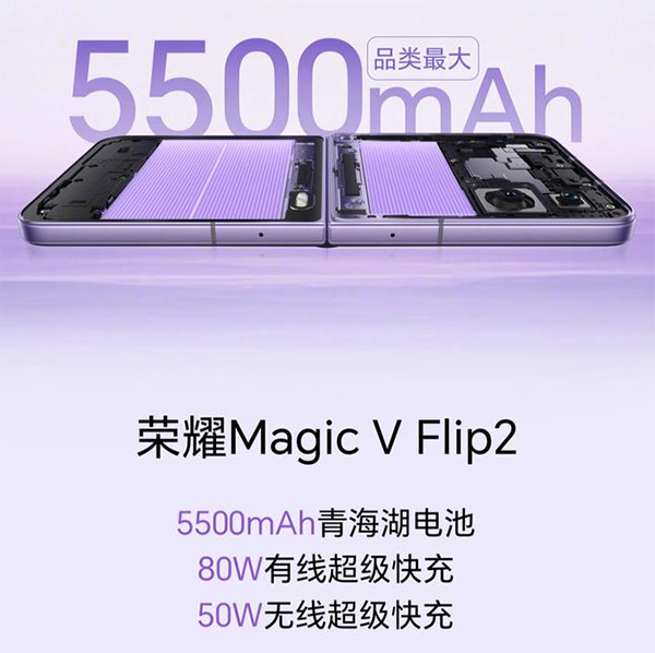 也就是說,榮耀Magic V Flip2配置的是5500mAh青海湖電池,支持80W有線超級快充,并且還支持50W無線充電功能。