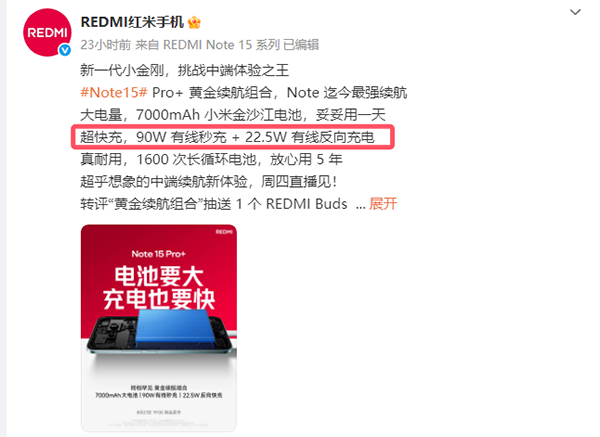 支持,紅米Note15 Pro+內(nèi)置的是7000mAh的小米金沙江電池,并且支持90W的有線快充以及22.5W的有線反向充電,這個反向充電功率還是比較大的。