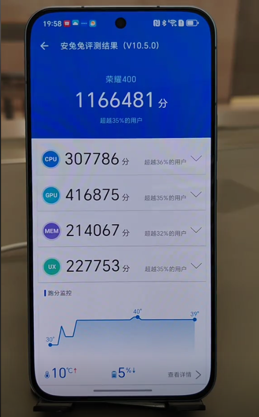 116萬(wàn)分左右,榮耀400采用的是驍龍7Gen4處理器,其性能天花板并不高,安兔兔測(cè)試跑分在116萬(wàn)分左右,并不高,屬于中端偏下的水平。
