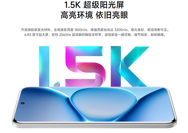 紅米Note15 Pro+屏幕參數(shù):尺寸是6.83英寸,中置打孔OLED等深微曲屏,小米青山護(hù)眼屏,分辨率是2772x1280(屬于是1.5K級別),LTPS(非LTPO),120Hz高刷新率,屏幕供應(yīng)商是華星光電,M9發(fā)光材料,3840Hz超高頻PWM調(diào)光,龍晶玻璃蓋板,19.5:9,447ppi,手動最高亮度800nits,全局最高亮度1800nits,局部峰值亮度3200nit,480Hz觸控采樣率(瞬時觸控采樣率2560Hz),支持杜比視界,HDR10+,HDRVivid,DCI-P3 色域,油/濕手觸控2.0。