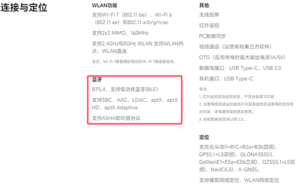 藍(lán)牙5.4,支持低功耗藍(lán)牙(BLE),支持SBC、AAC、LDAC、aptX、aptX HD、aptX Adaptive,支持ASHA助聽器協(xié)議。