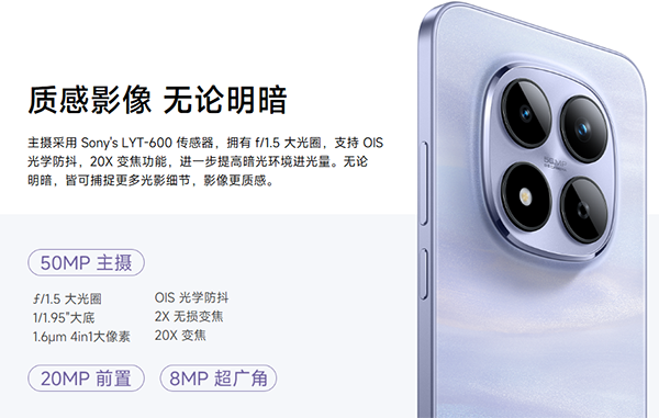 從這個(gè)影像的配置上可以看出,這個(gè)紅米Note15 Pro的影像系統(tǒng)走的是實(shí)用路線,5000萬(wàn)像素索尼LYT600主攝配備f/1.5大光圈,在光線充足的情況下表現(xiàn)不錯(cuò),暗光環(huán)境下的進(jìn)光量也比前代提升80%。